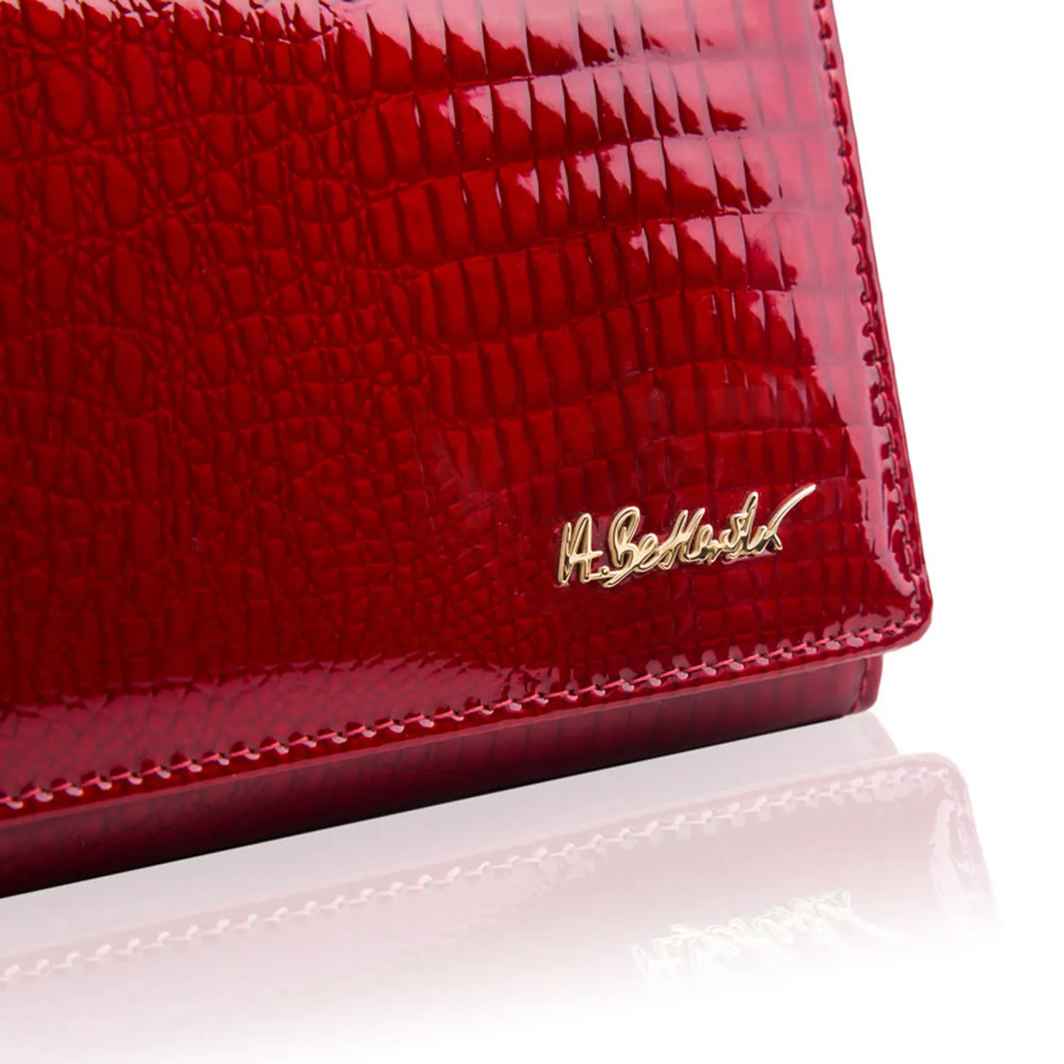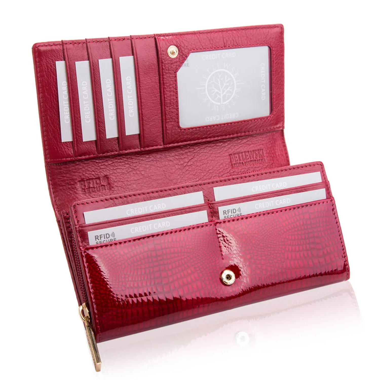 Portfel damski BETLEWSKI BPD-CR-106 w kolorze czerwonym wyróżnia się efektownym designem inspirowanym fakturą skóry węża typu croco. Wykonany z wysokiej jakości lakierowanej skóry naturalnej, przyciąga uwagę subtelnym połyskiem i luksusowym charakterem. To idealny wybór dla kobiet, które cenią elegancję połączoną z wyrazistym stylem oraz dodatki podkreślające indywidualność.